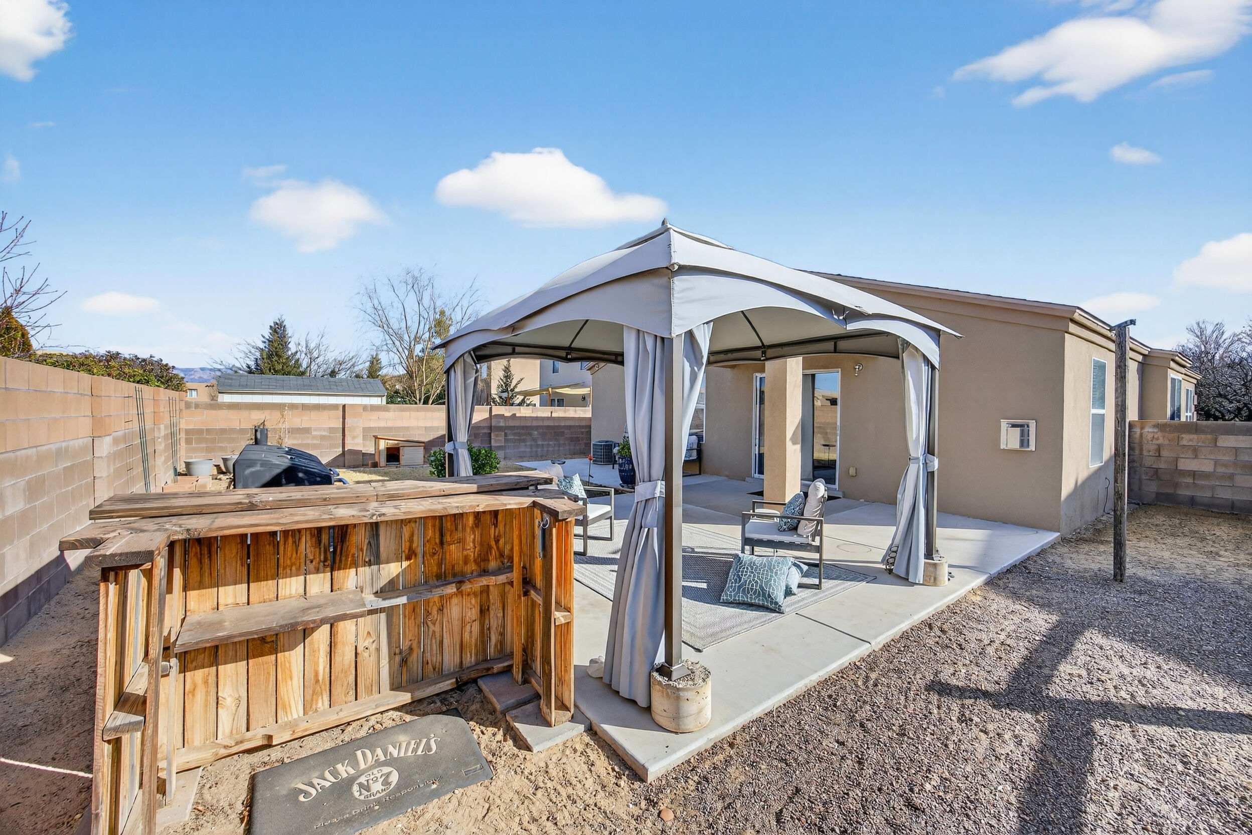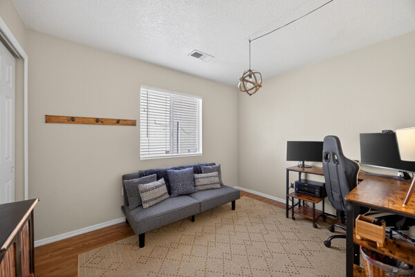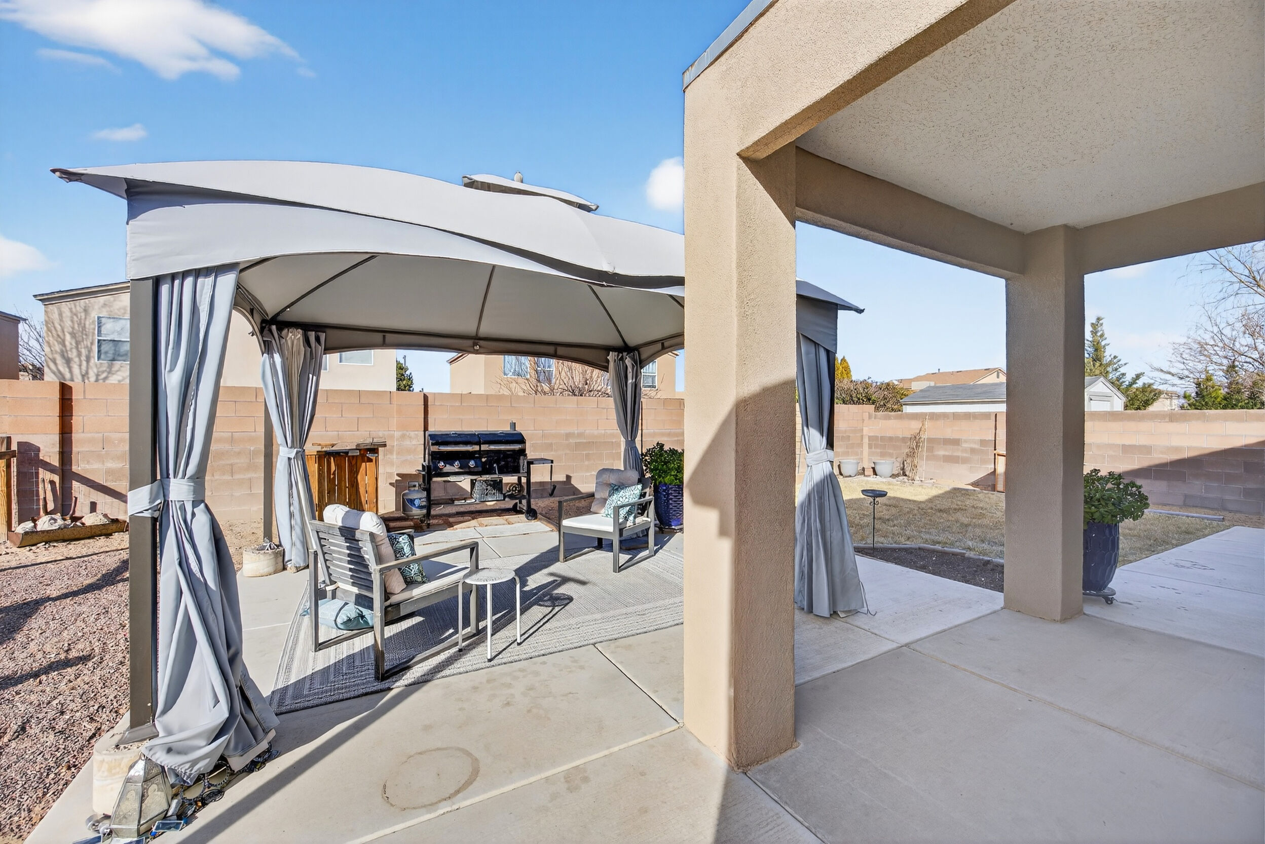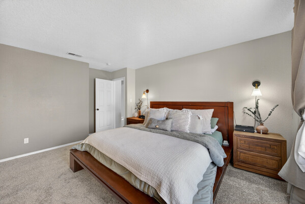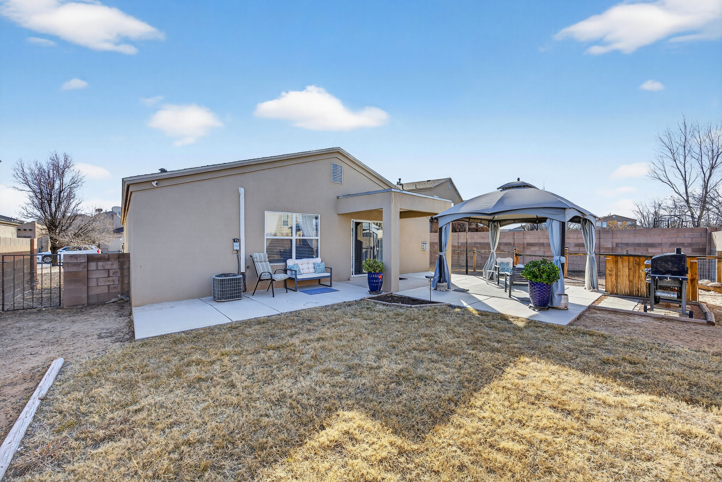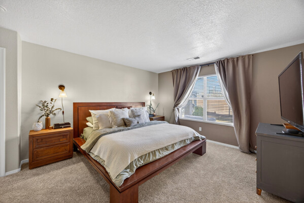 The master bedroom is a peaceful retreat with an en-suite bathroom and walk-in closet. Two additional bedrooms provide plenty of space for guests or a home office. Outside, the backyard offers a private oasis with a patio and room for gardening.