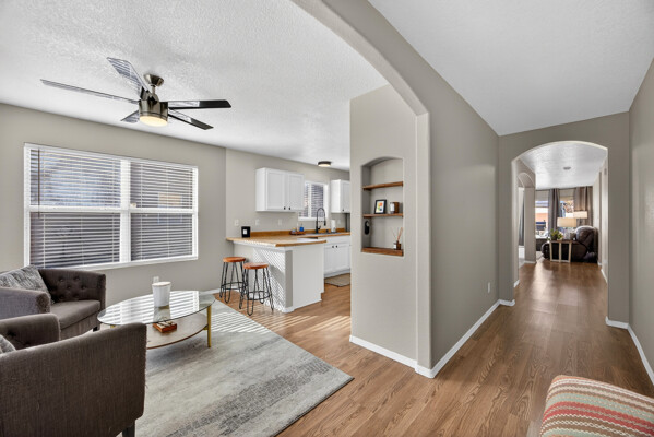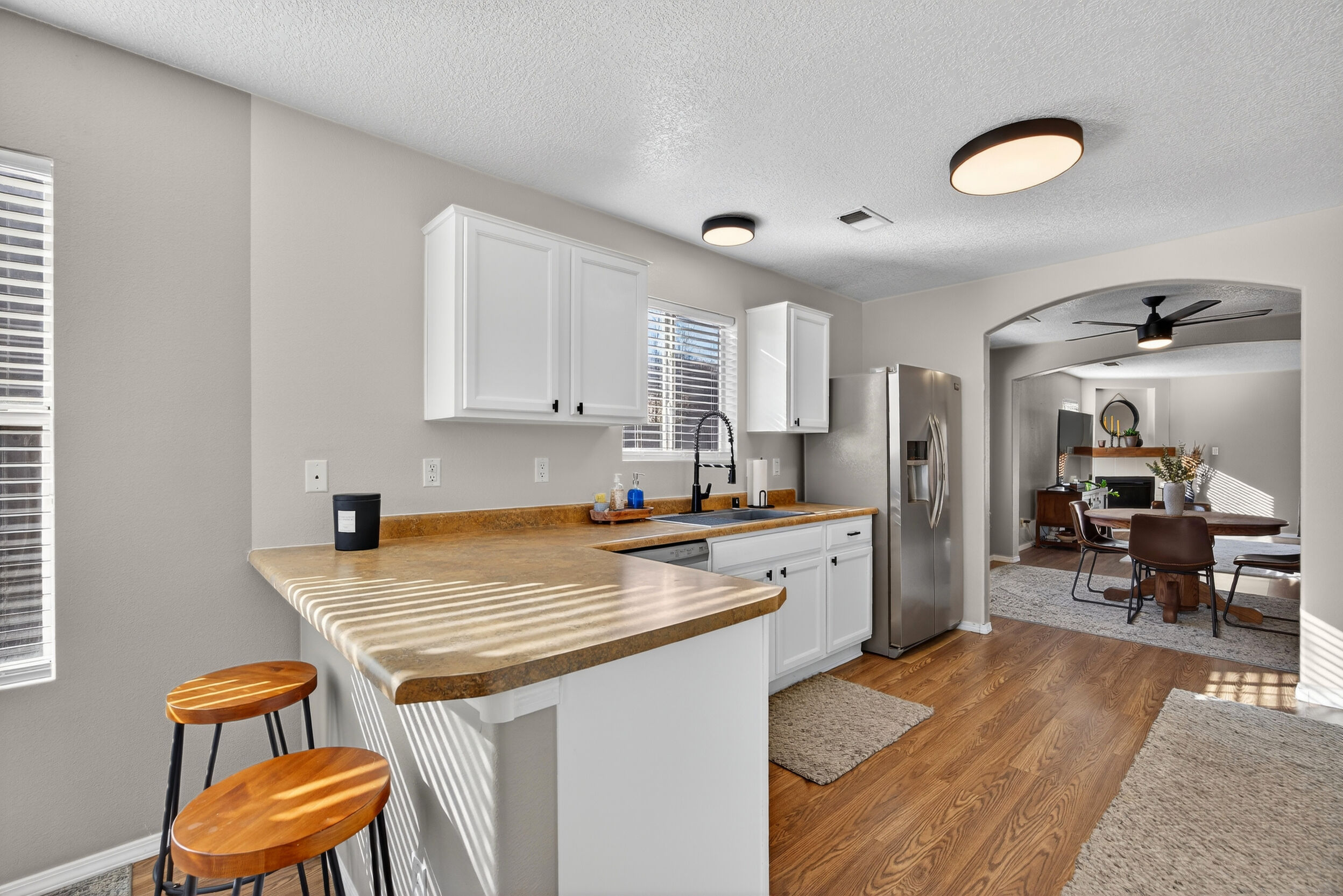As you step inside, you are greeted by an open floor plan that is flooded with natural light. The spacious living room is perfect for entertaining guests or relaxing after a long day. The kitchen features modern appliances and ample counter space, making meal prep a breeze.